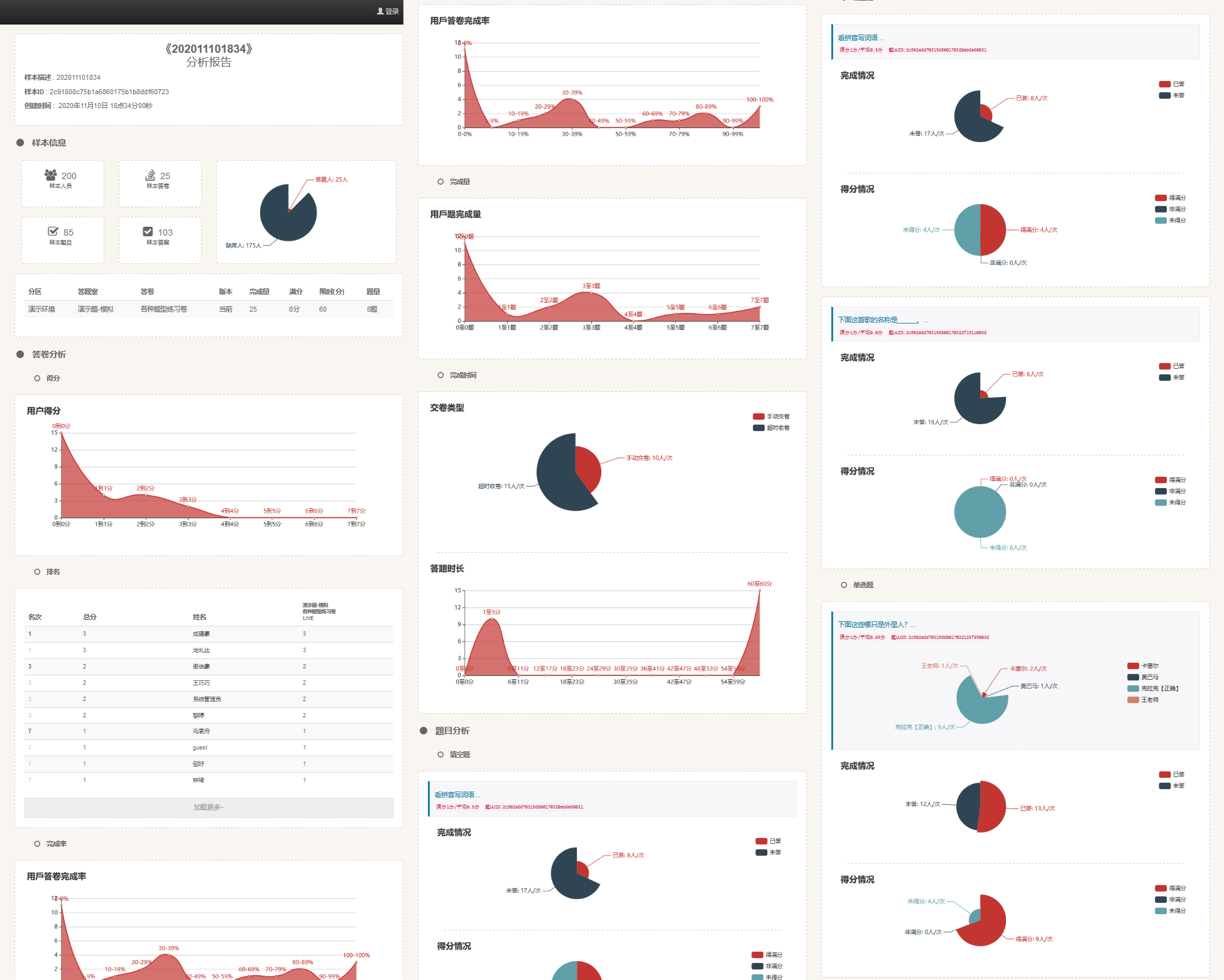 对答题室中用户答題得分进行统计分析、对答题室中的题目进行答題统计、对各答卷进行答題统计,通过图形和表格方式进行直观展示。
