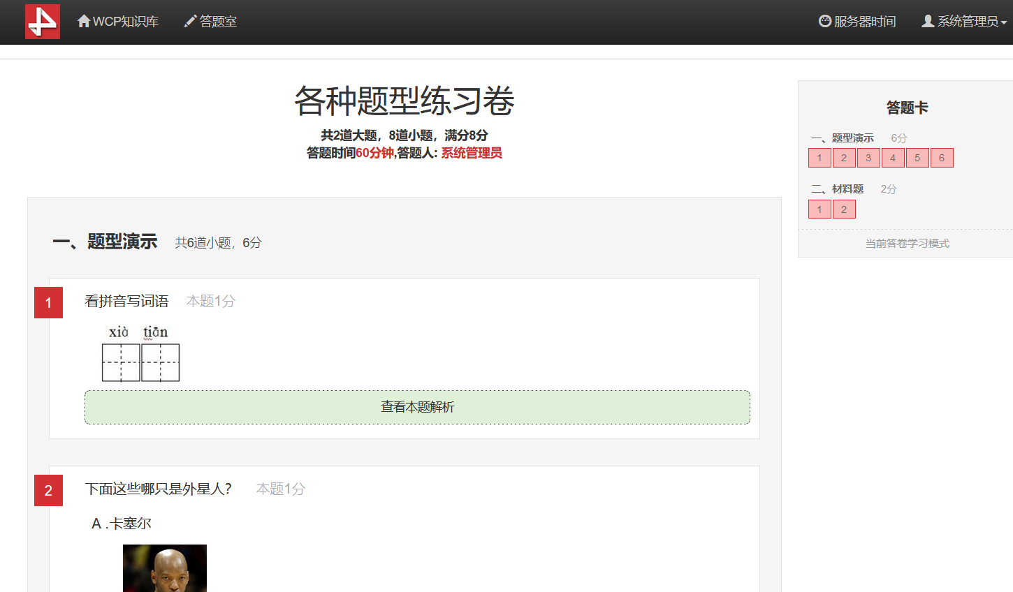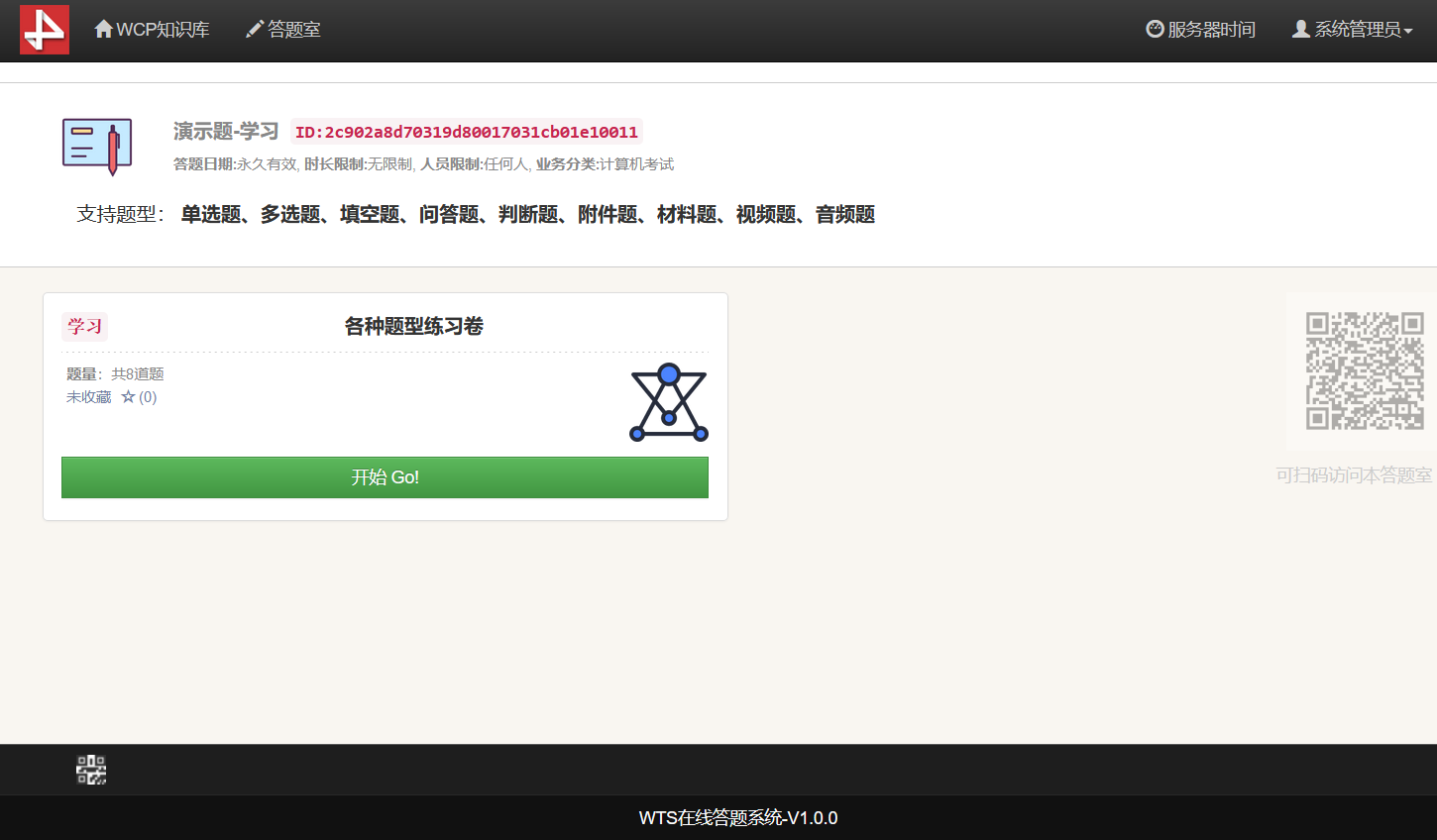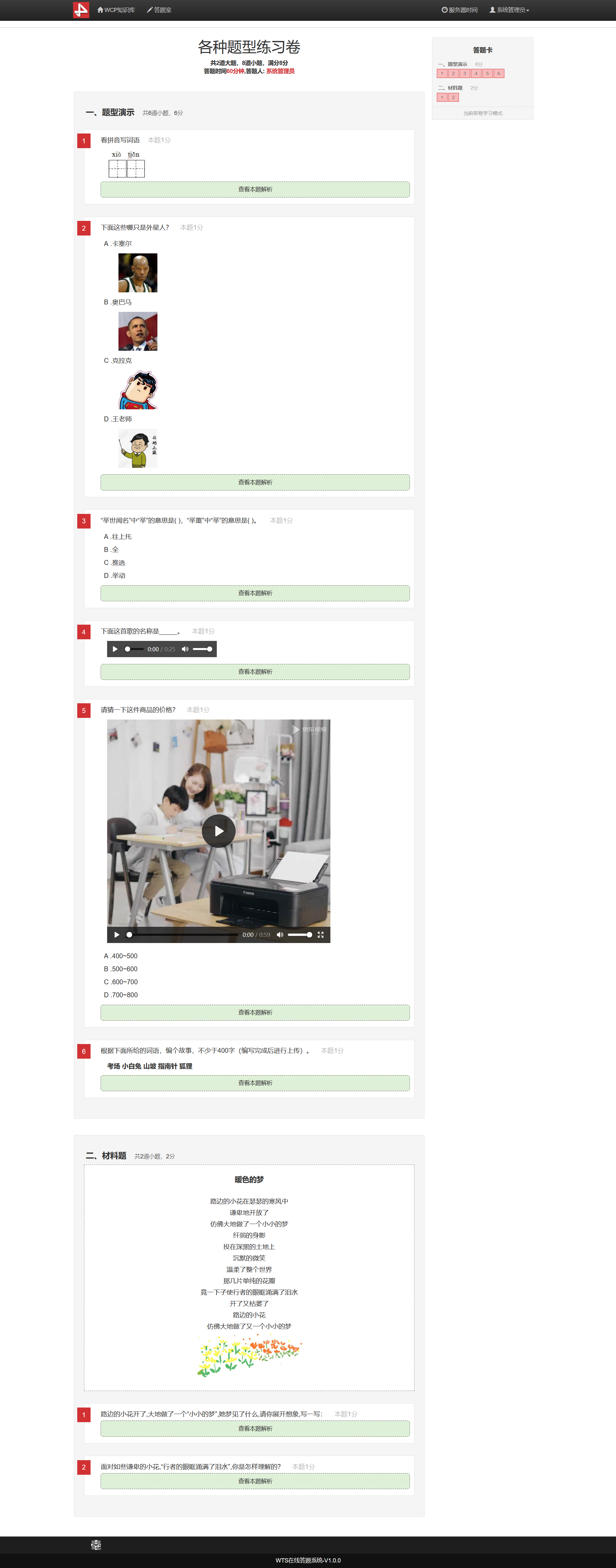 支持 单选题 / 多选题 / 填空题 / 问答题 / 视频题 / 音频题 / 判断题
