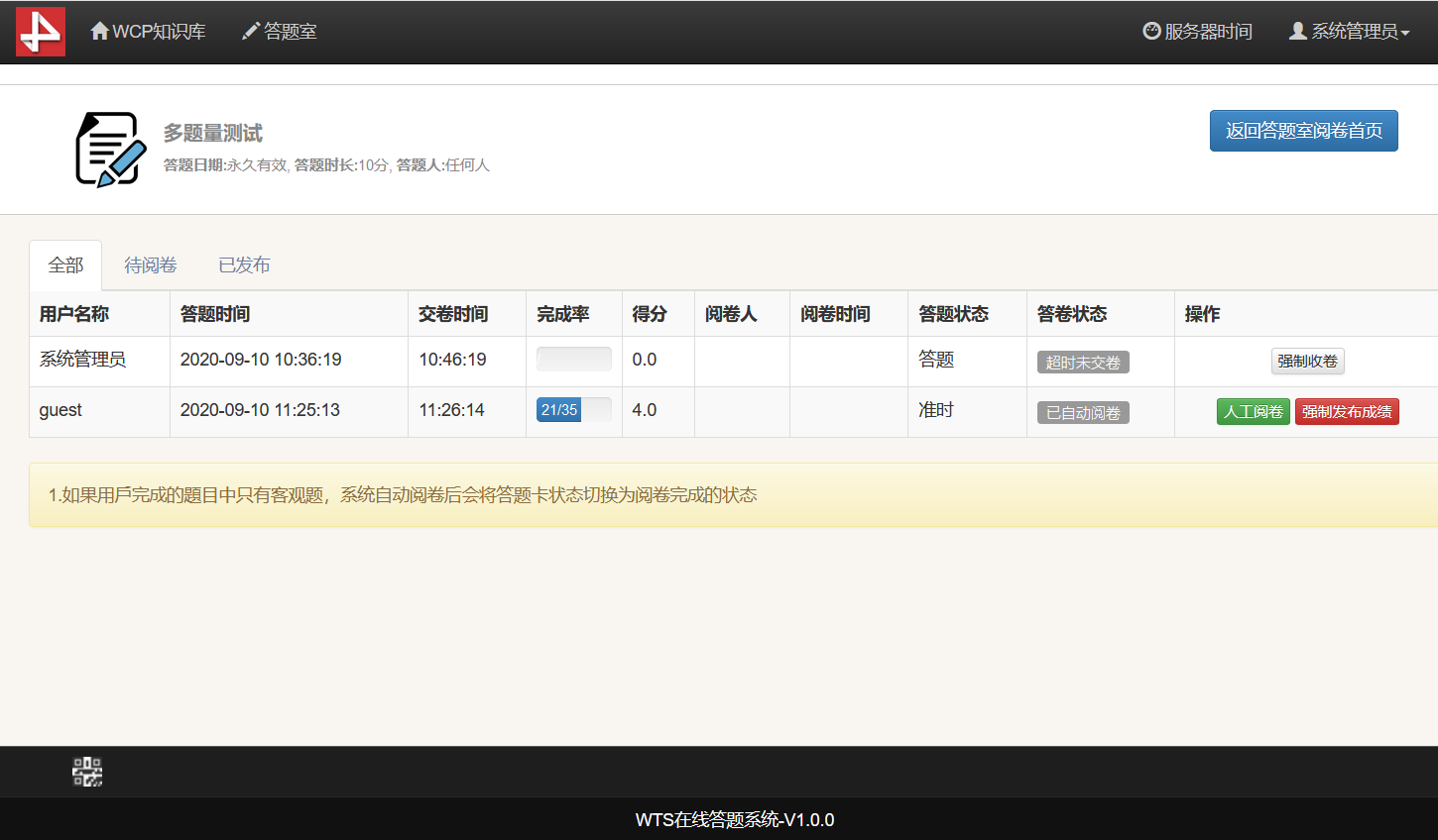 客观题系统自动进行阅卷打分,主观题系统辅助人工进行阅卷打分,当用户所答题目全部是客观题时可实时发布分数。